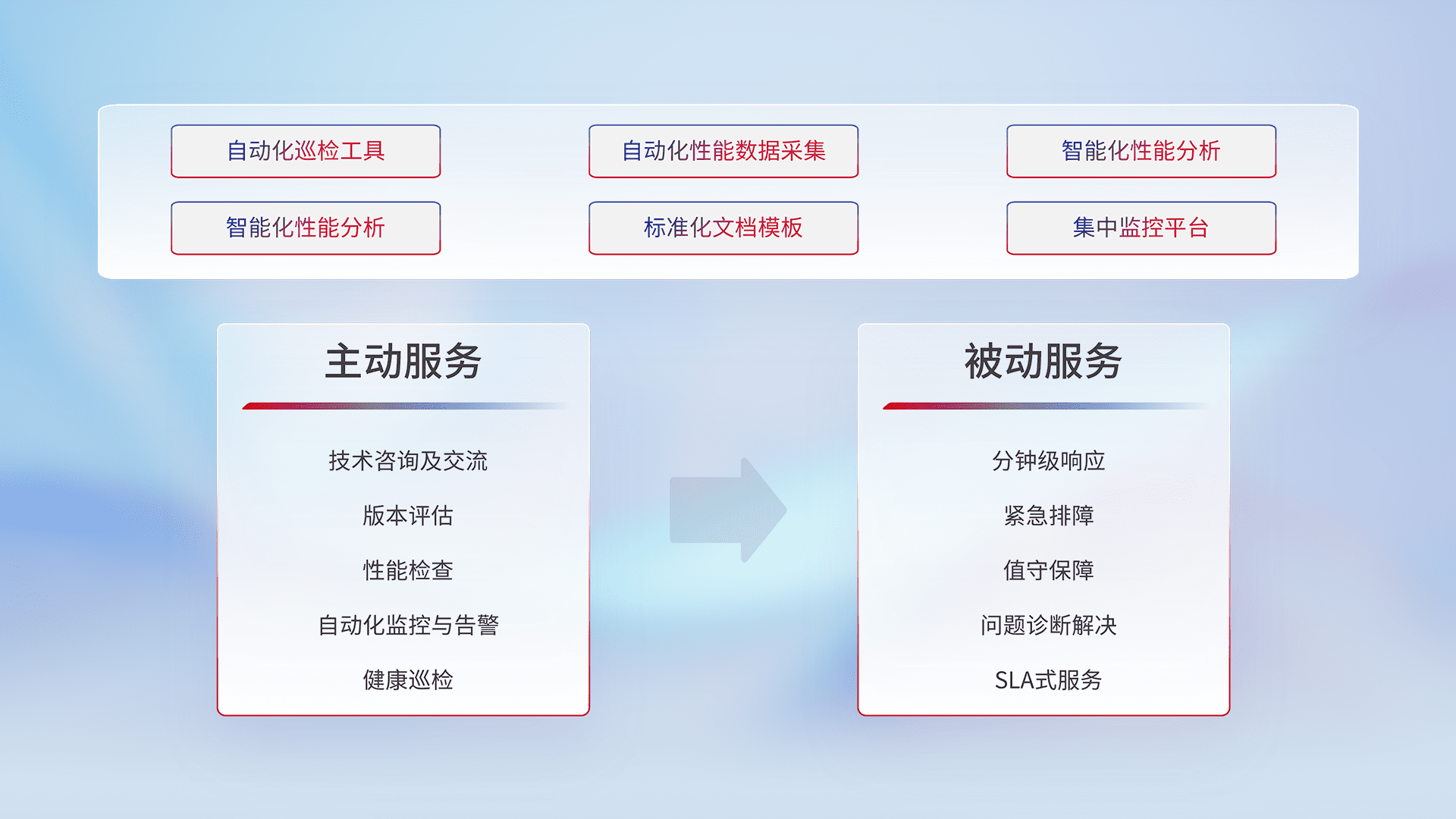 智能化工具和标准化文档,,,保障服务质量,,提供主动服务(包含技术咨询、、、版本评估、、、性能检查、、自动化监控与告警、、、、健康巡检)和被动服务包含(分钟级响应、、紧急排障、、值守保障、、问题诊断解决、、、SLA服务)。。